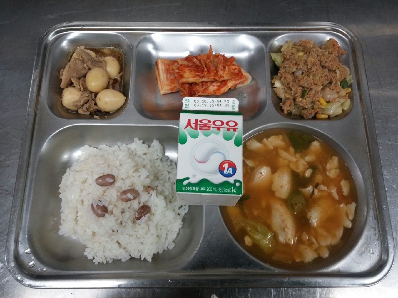 조식 : 강낭콩밥, 순두부찌개, 돈육메추리알장조림, 고추참치야채볶음, 배추김치, 우유
