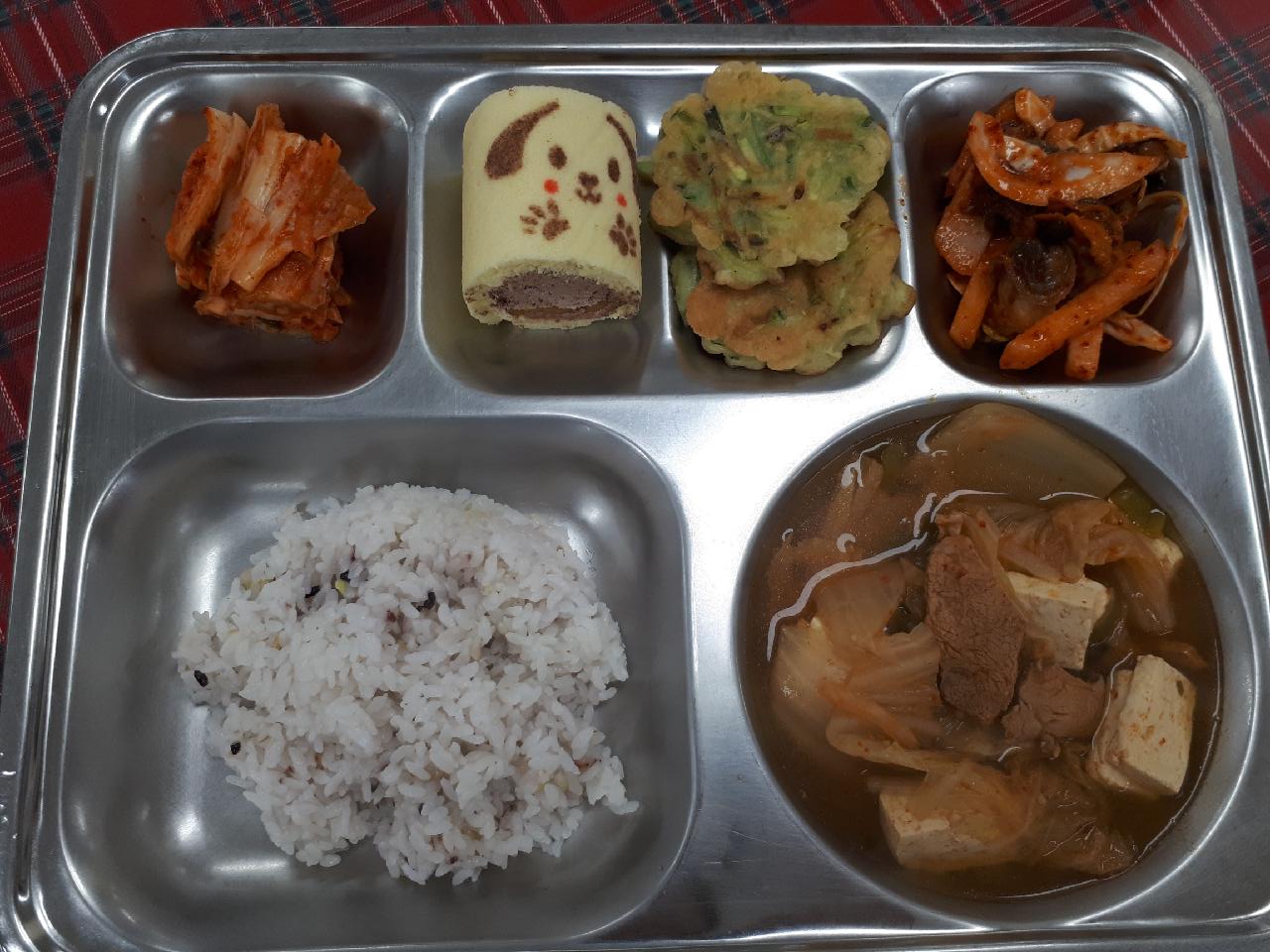 석식 : 혼합잡곡밥, 사태김치찌개, 꼬막배무침, 애호박전, 배추김치, 멍멍이롤케익