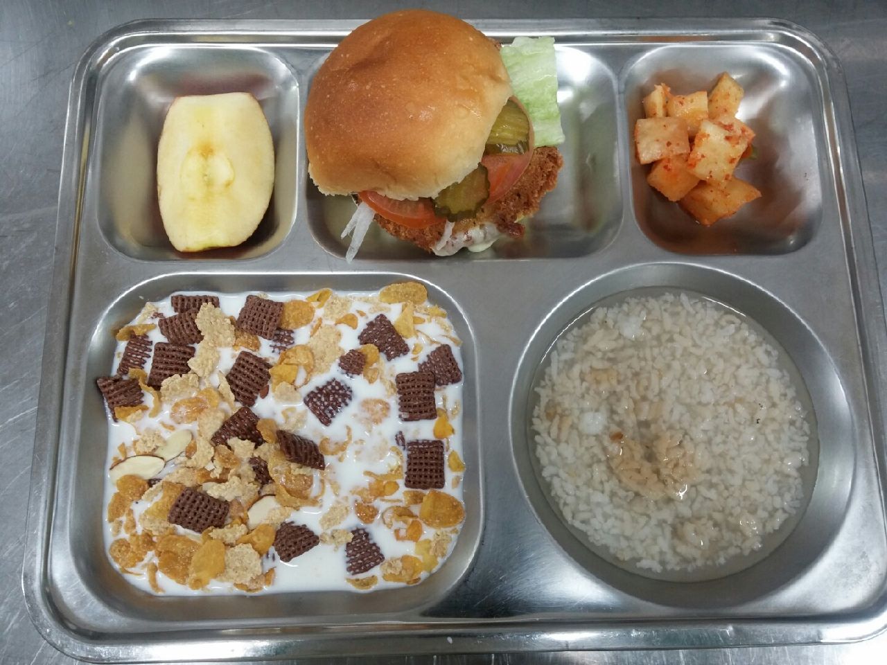 조식 : 리얼치즈버거, 시리얼/우유, 사과, 숭늉/배추김치