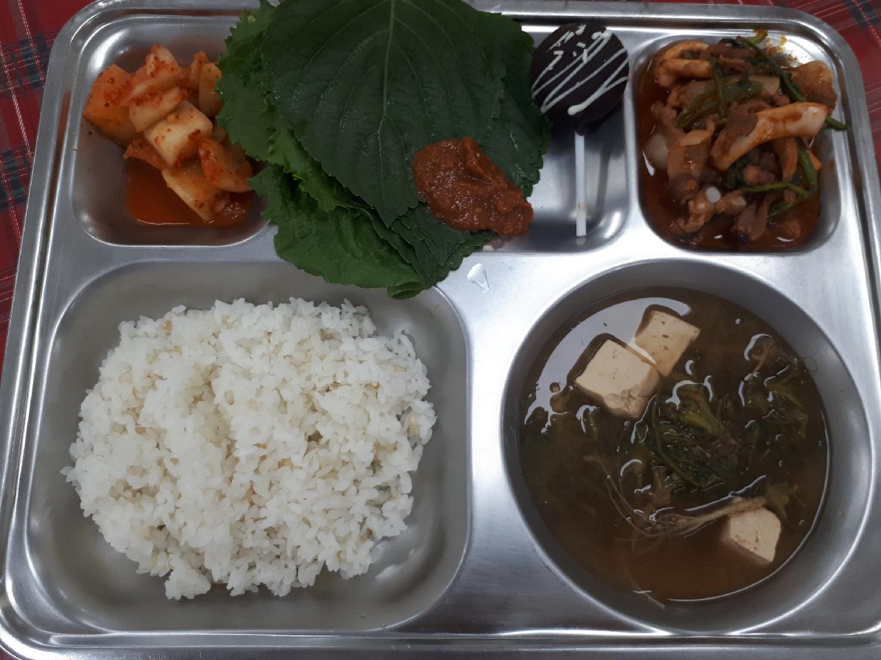 중식 : 현미찹쌀밥, 냉이두부된장국, 오삼불고기, 상추,깻잎/쌈장, 배추김치, 우리쌀초코케익팝