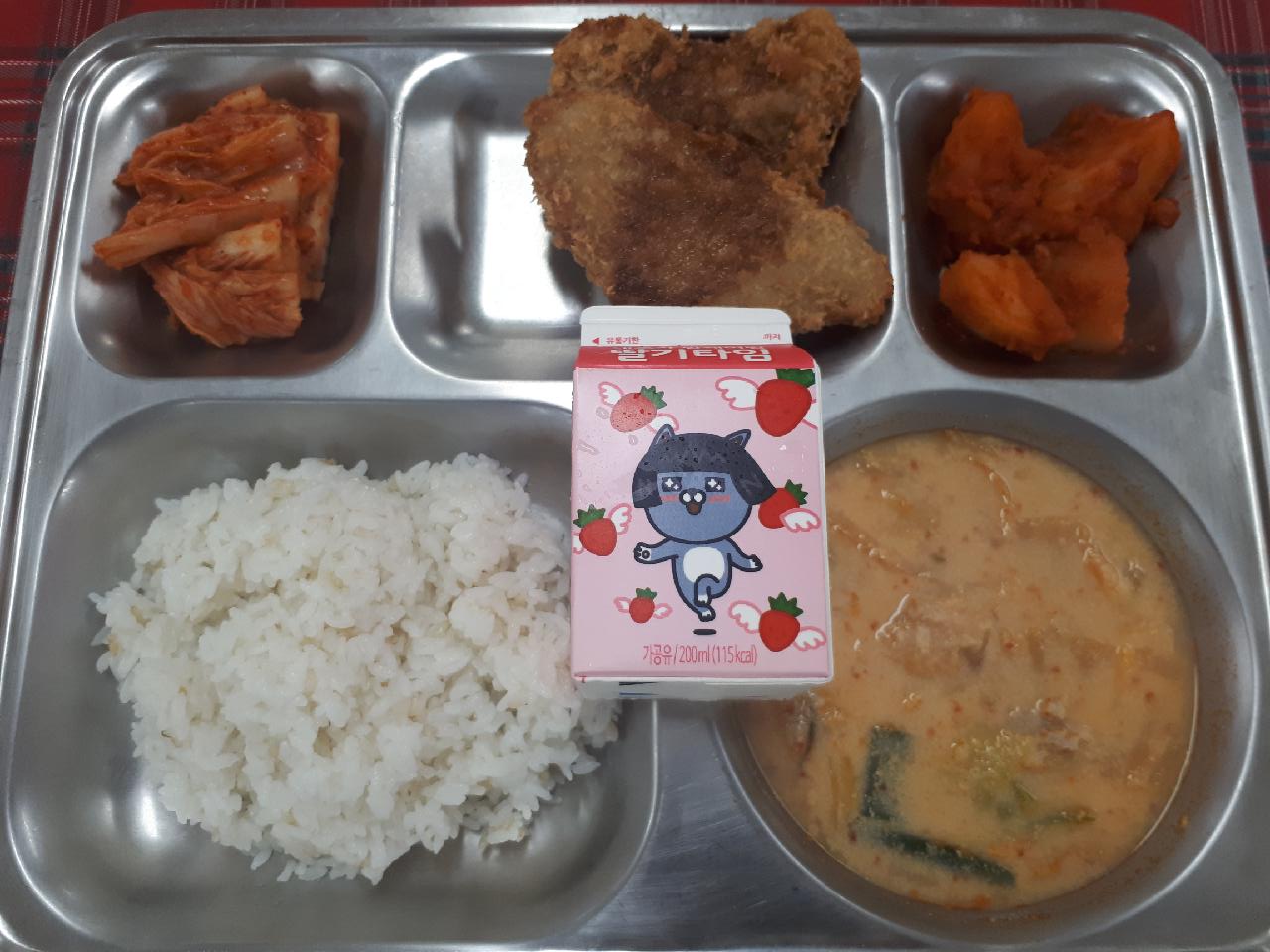석식 : 발아현미밥, 콩비지찌개, 참치까스/핫소이소스, 감자매운조림, 배추김치, 딸기타임