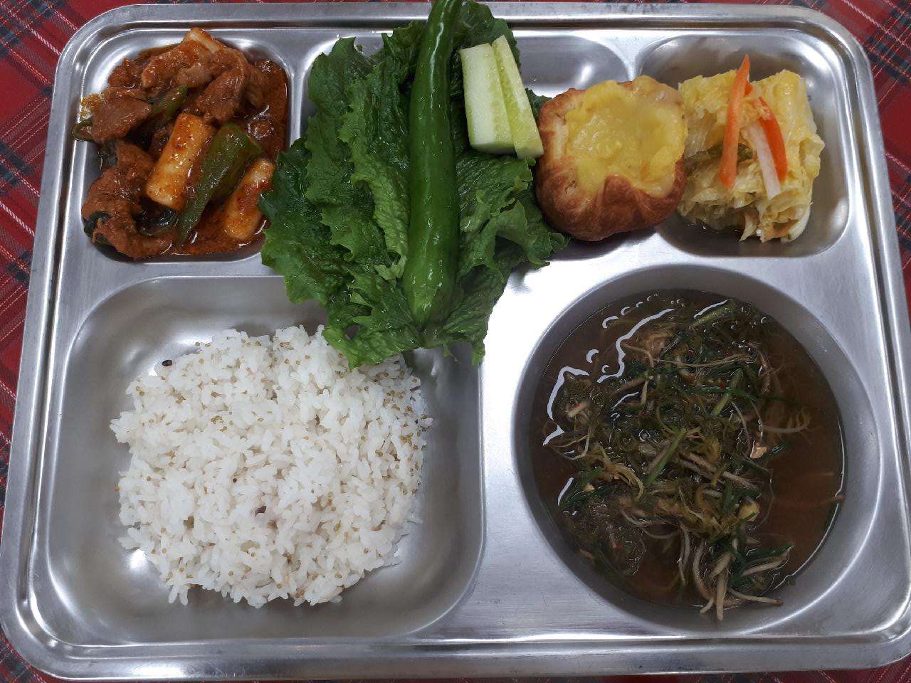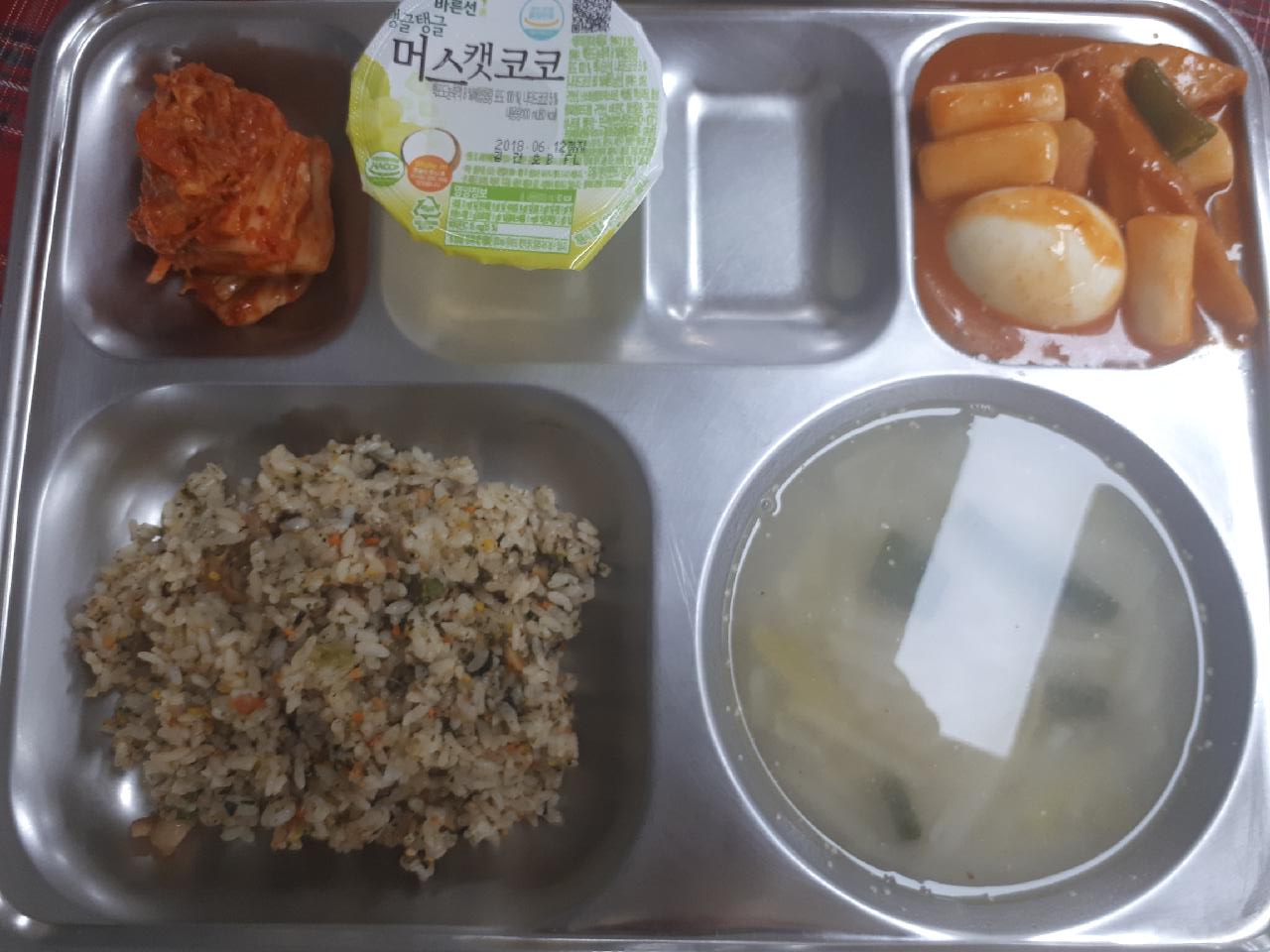 석식 : 해물필라프, 들깨가루무채국, 계란떡볶이, 배추김치, 머스캣코코