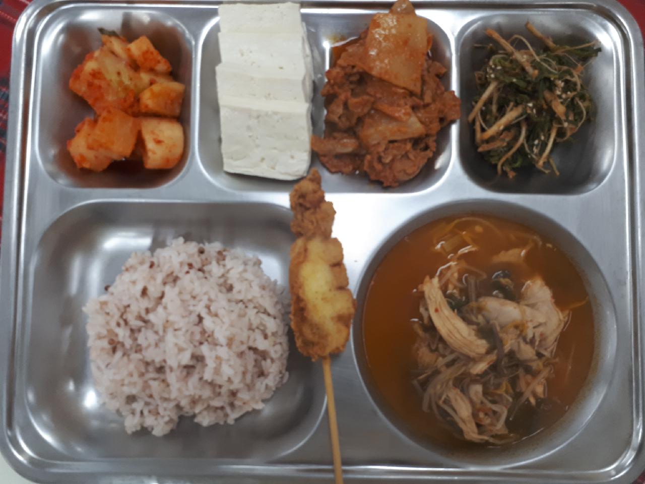 중식 : 수수밥, 닭개장, 돈육김치볶음/온두부, 냉이나물, 깍두기, 갑오징어튀김
