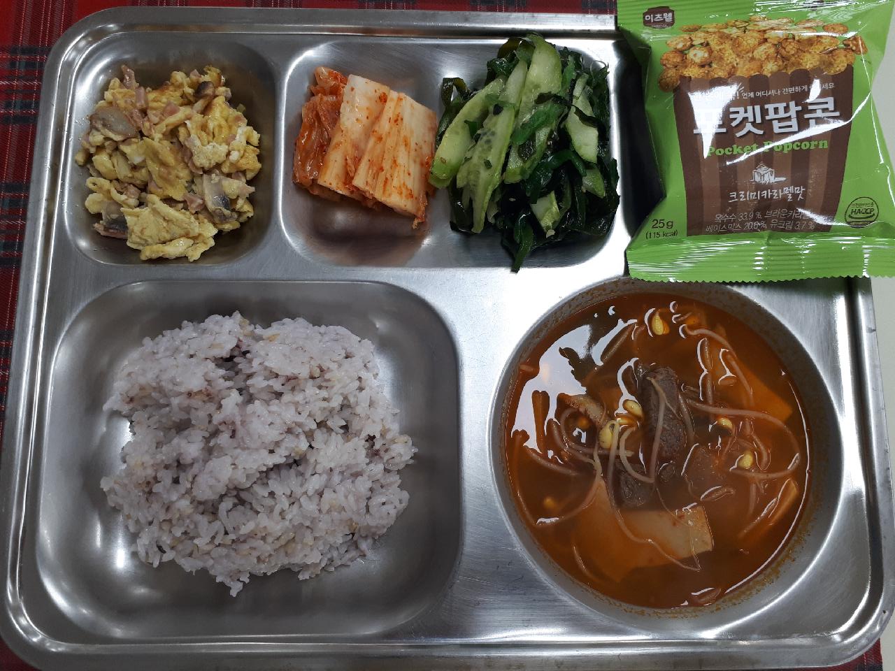 석식 : 혼합잡곡밥, 소고기버섯찌개, 양송이스크램블, 오이해초무침, 배추김치, 포켓팝콘