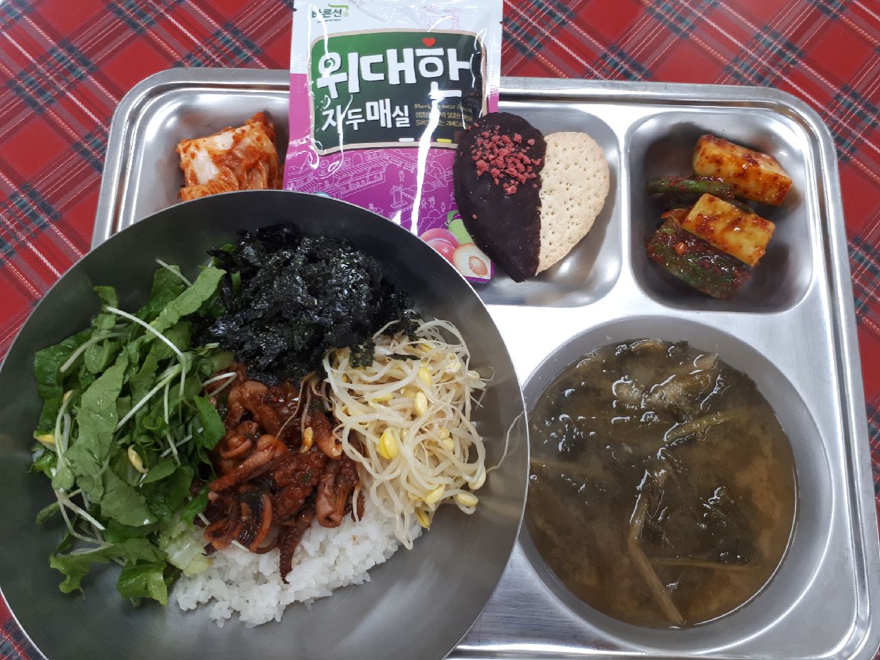 석식 : 낙지야채비빔밥, 시래기국, 스틱오이무침, 배추김치, 사랑해파이, 쥬스