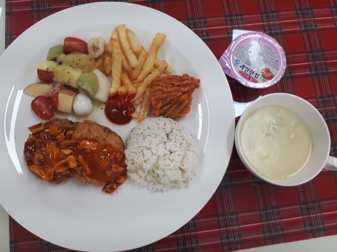 중식 : 차조밥, 해물돈까스, 양송이스프, 과일샐러드/키위소스, 감자튀김/케찹, 배추김치,스무디