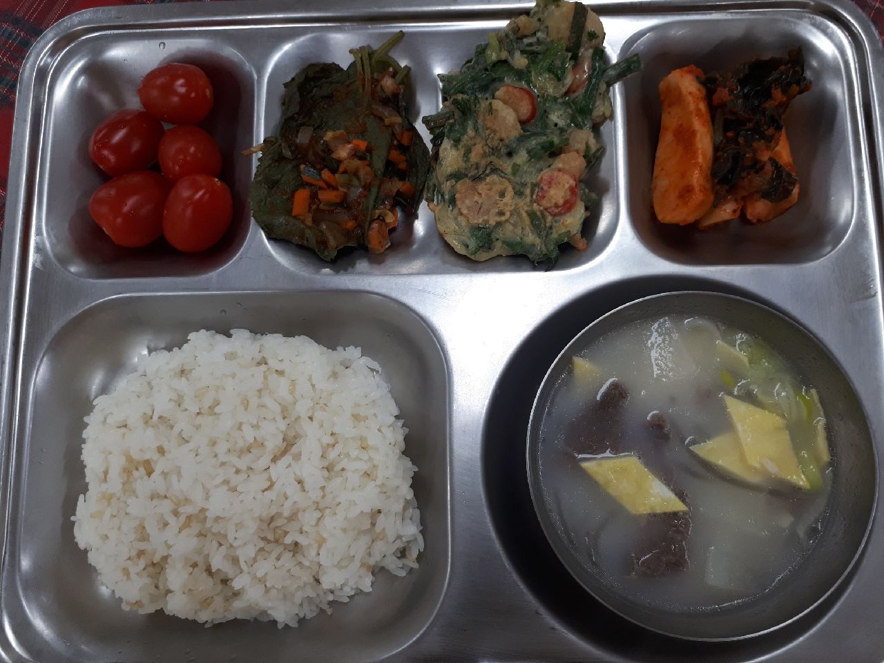 중식: 현미찹쌀밥, 설렁탕/당면사리, 깻잎찜, 새우부추전, 총각김치, 방울토마토