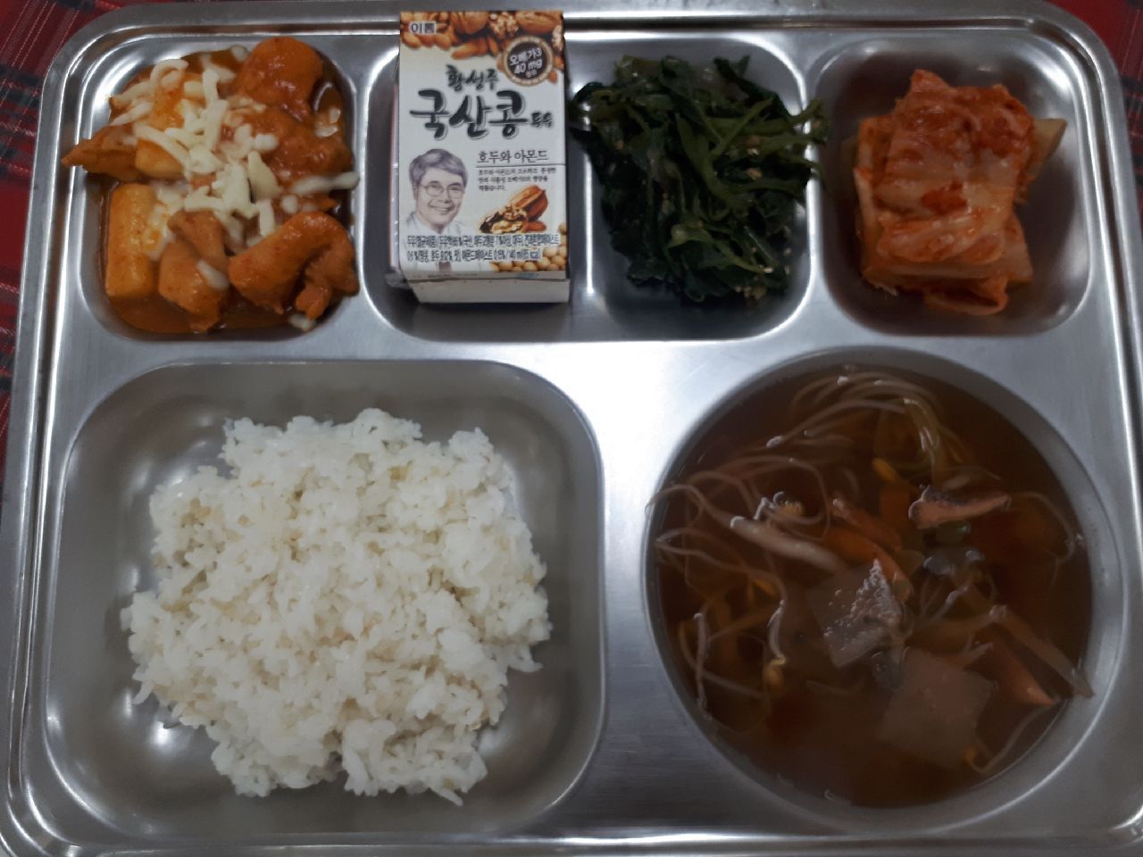 석식 : 현미찹쌀밥, 오징어느타리국, 치즈불닭, 취나물된장볶음, 배추김치, 호두아몬드두유