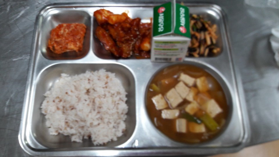 조식 : 수수밥, 호박두부된장국, 칠리닭조림, 김무생채, 배추김치, 우유