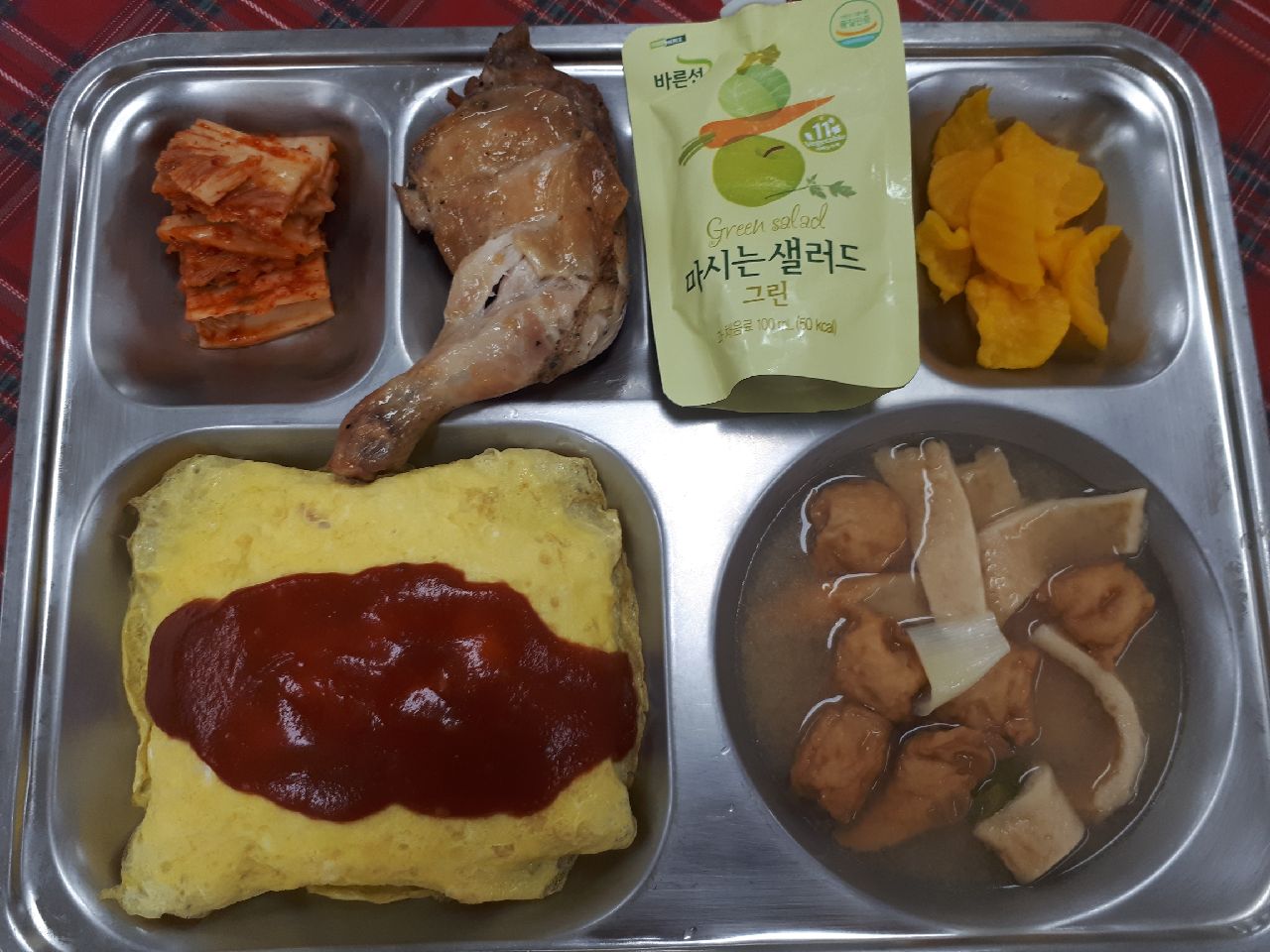 중식 : 오므라이스/브라운소스, 어묵미소국, 단무지, 배추김치, 장각오븐구이, 마시는샐러드
