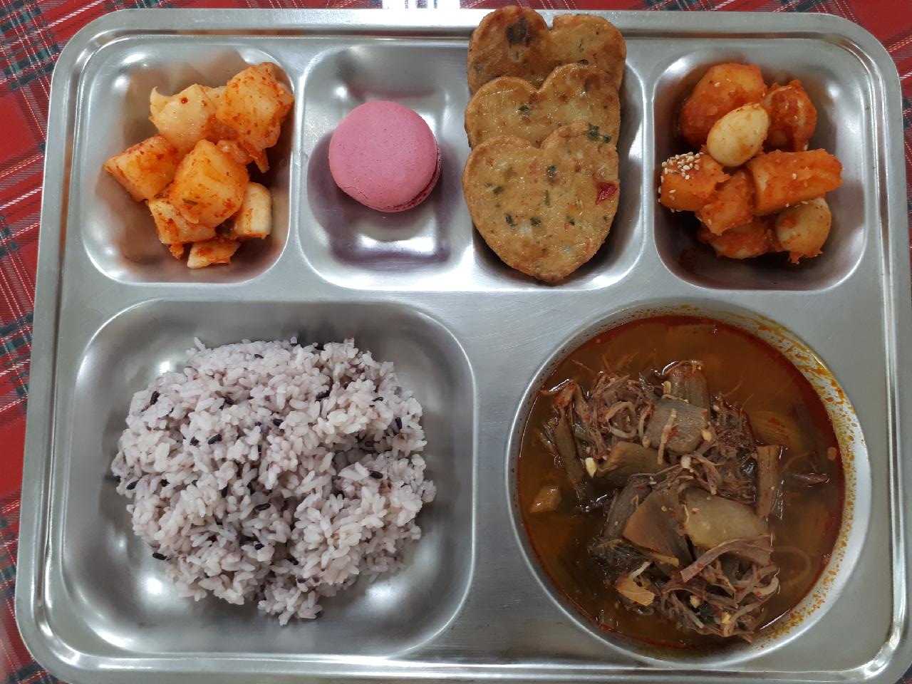 5일 중식 : 흑미밥, 육개장, 메추리알감자조림, 연근전, 깍두기, 마카롱