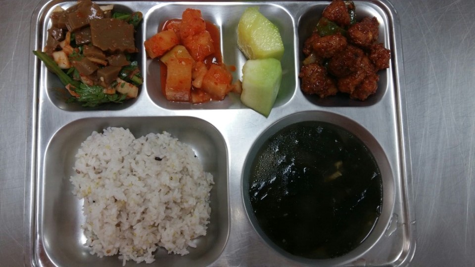 22일 중식 : 혼합10곡밥, 소고기미역국, 삼채미트볼케찹볶음, 도토리묵김치무침, 깍두기, 메론