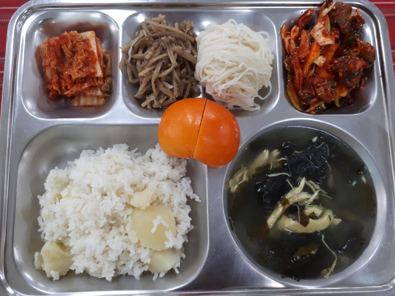 30일 중식 : 감자밥, 닭고기미역국, 골뱅이소면무침, 고구마순볶음, 배추김치, 단감