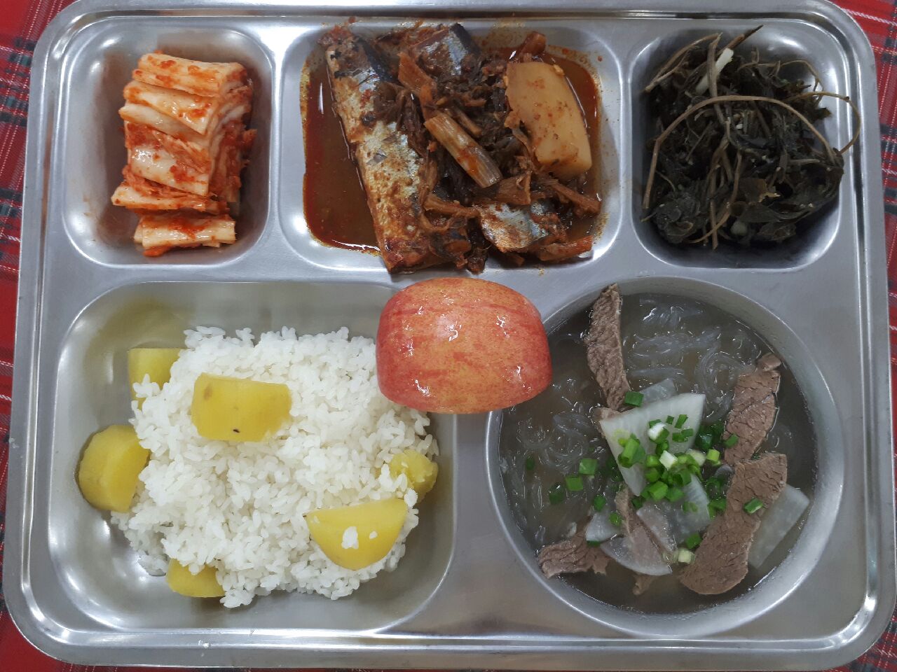 13일 중식 : 고구마밥, 소고기당면국, 꽁치시래기조림, 취나물볶음, 배추김치, 사과