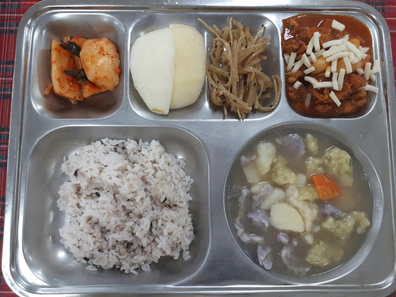 2일 중식 : 혼합잡곡밥, 삼색수제비국, 치즈불닭, 쥐어채볶음, 깍두기, 배