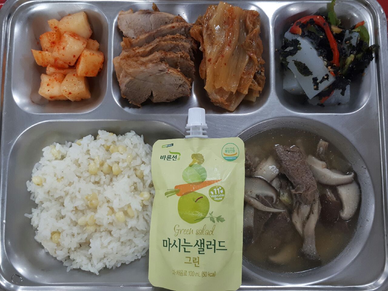 8일 중식 : 옥수수밥, 버섯들깨국, 사태김치찜, 청포묵무침, 깍두기, 마시는샐러드