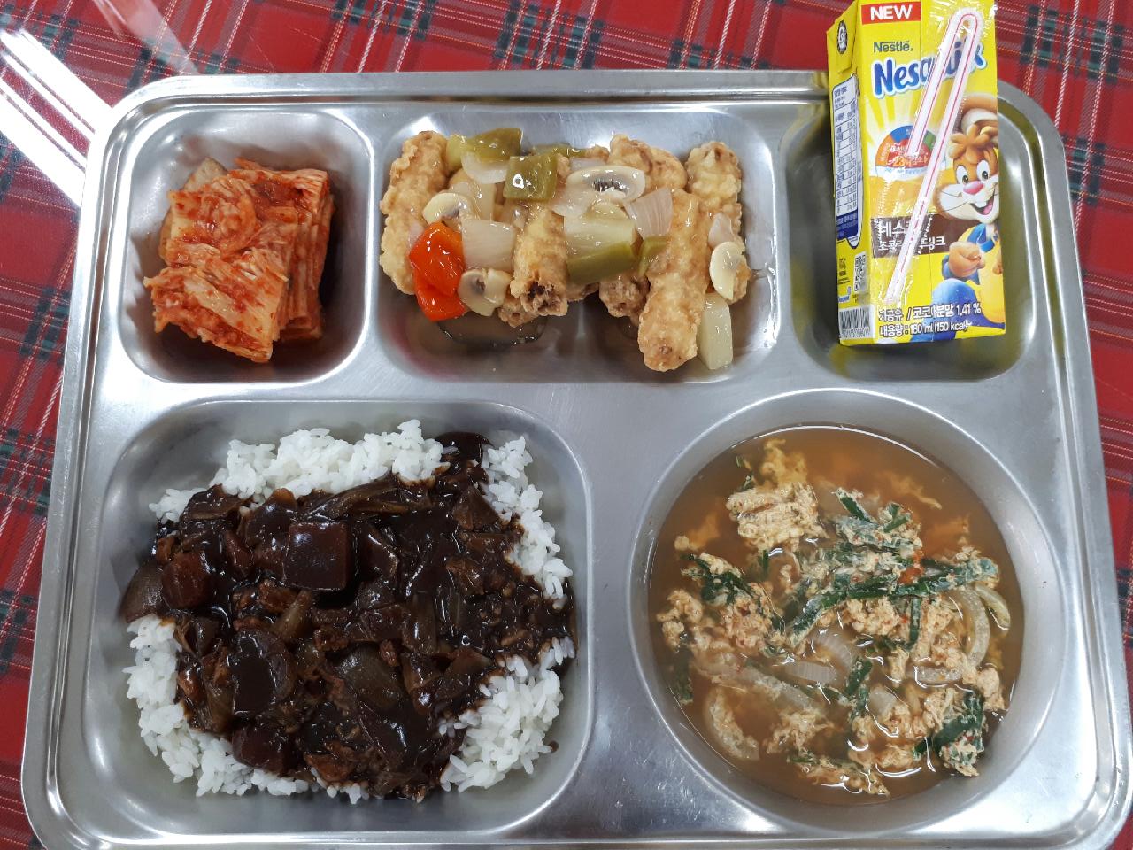 24일 중식 : 짜장밥, 매운부추계란국, 파인탕수육, 배추김치, 네스퀵