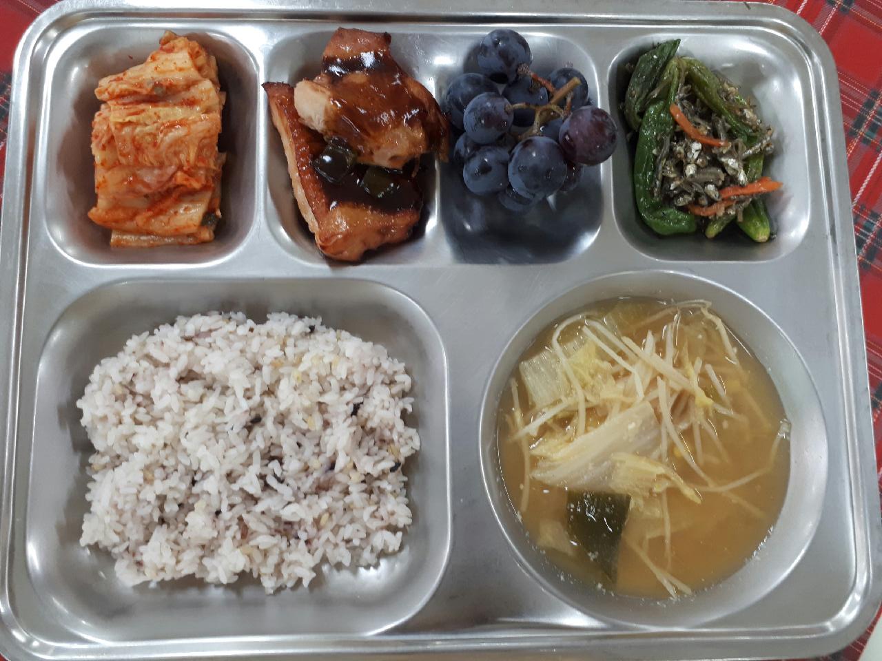 30일 중식 : 혼합잡곡밥, 콩가루배추국, 닭고기스테이크, 멸치꽈리고추볶음, 배추김치, 포도