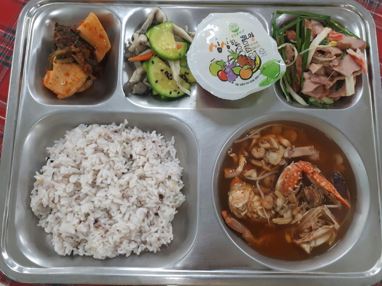 17일 중식 : 혼합잡곡밥, 꽃게해물탕, 훈제돼지목살냉채, 애호박느타리볶음, 깍두기, 모듬과일