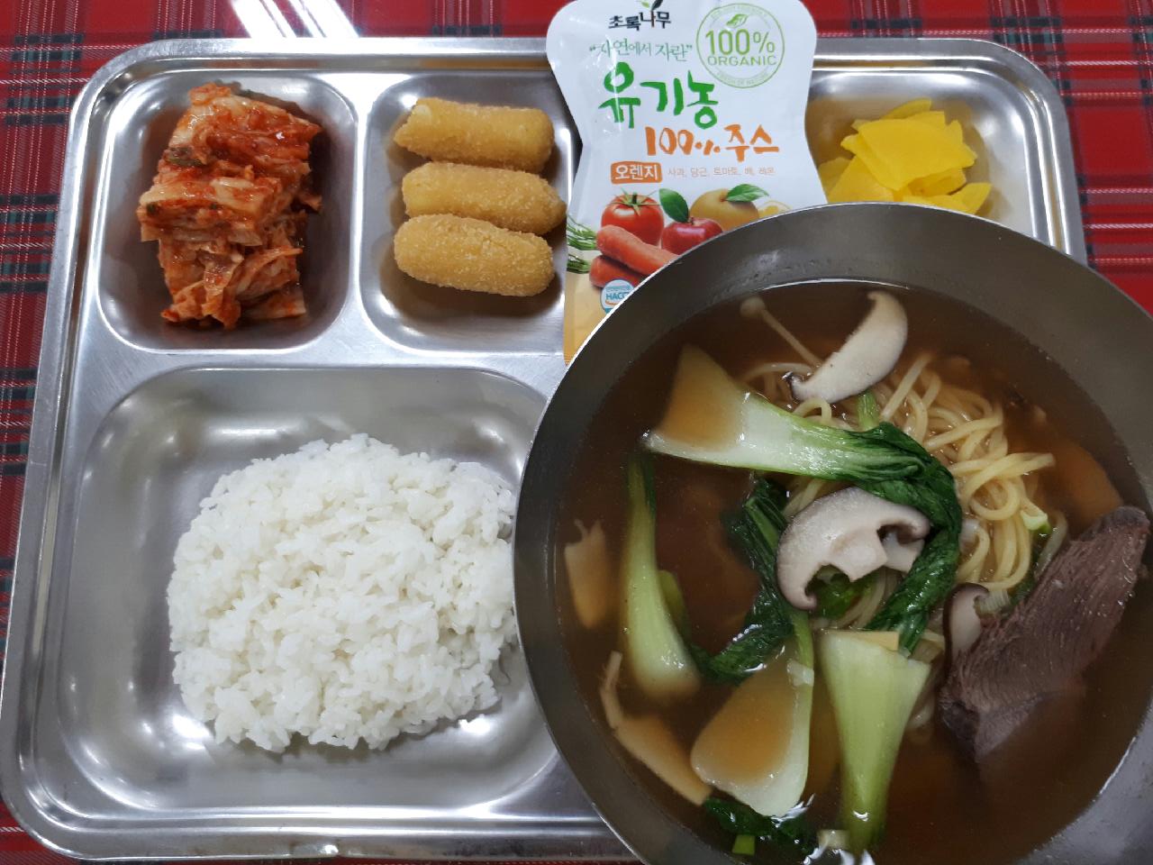 18일 중식 : 흰밥, 우육탕면, 꼬들단무지, 배추김치, 고구마치즈스틱, 쥬스