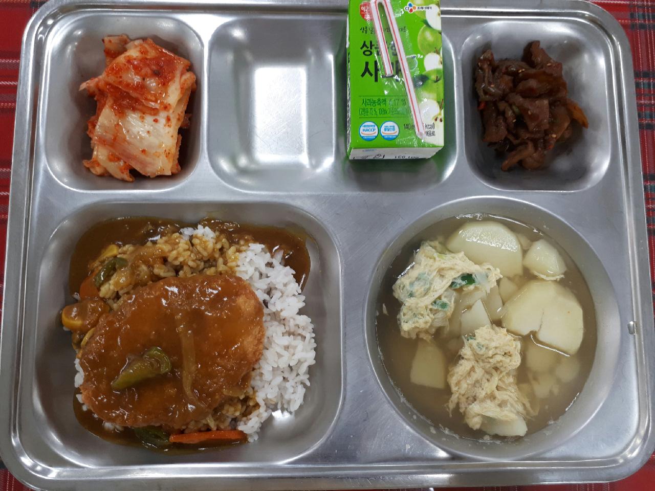 19일 중식 : 혼합잡곡밥, 감자계란국, 새우까스카레덮밥, 무장아찌무침, 배추김치, 사과쥬스