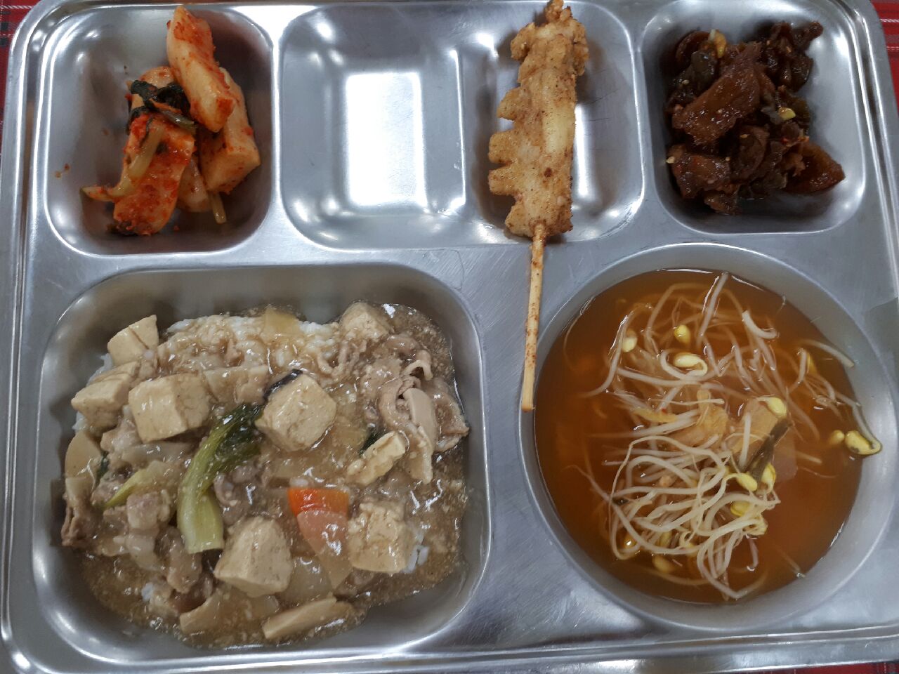 20일 중식 : 삼겹살두부덮밥, 김치콩나물국, 오복채무침, 배추김치, 갑오징어튀김