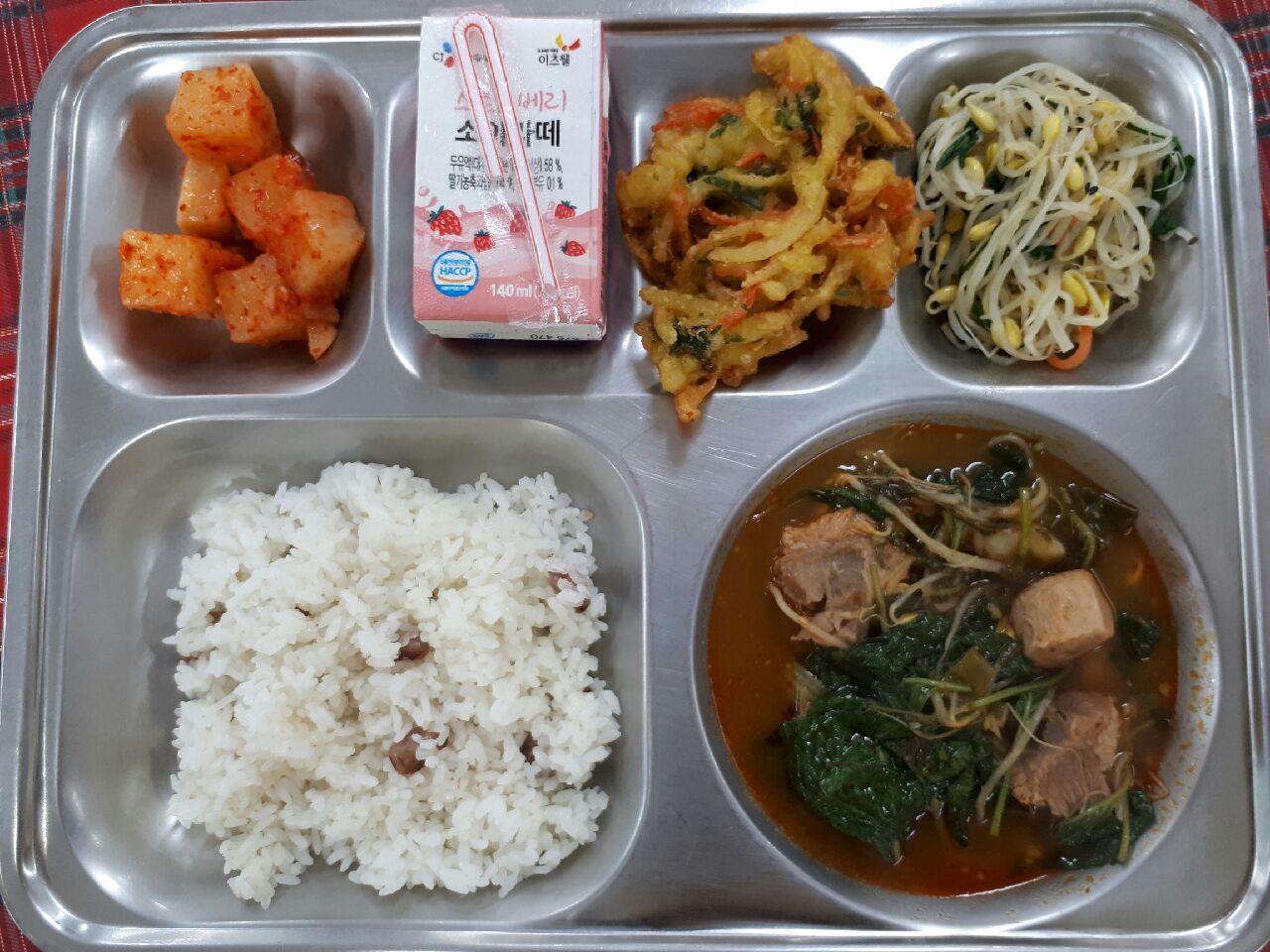 10일 중식 : 강낭콩밥, 돼지갈비감자탕, 콩나물부추무침, 깍두기, 야채튀김, 소이라떼
