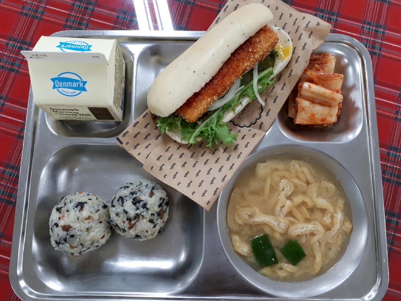 11일 중식 : 소고기주먹밥, 유부미소국, 배추김치, 치킨강정샌드, 시리얼우유