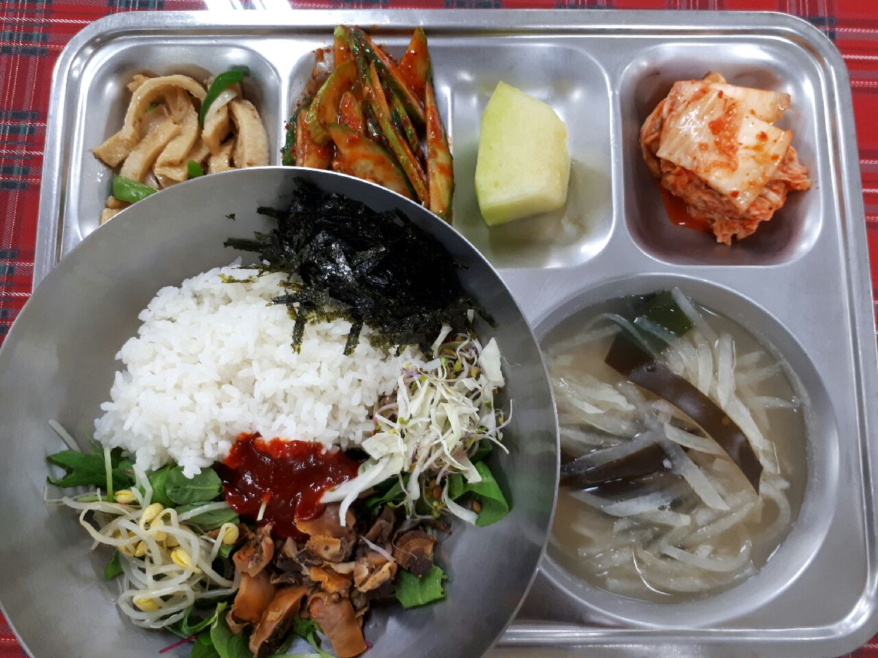 16일 중식 : 꼬막비빔밥, 다시마무채국, 오이초무침, 어묵채간장볶음, 배추김치, 메론