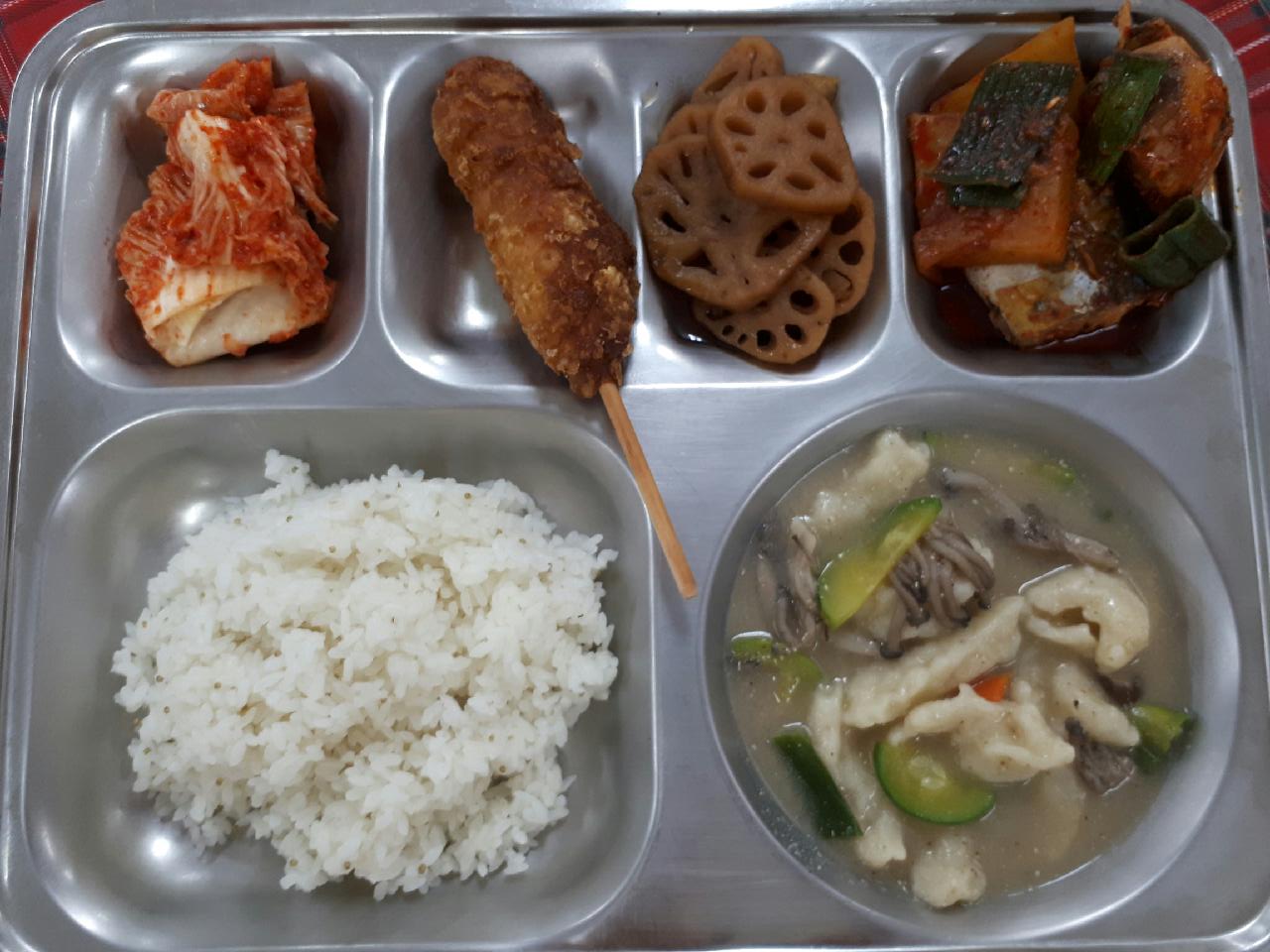 28일 중식 : 차조밥, 버섯들깨수제비, 고등어무조림, 연근조림, 배추김치, 콘프레이크핫도그