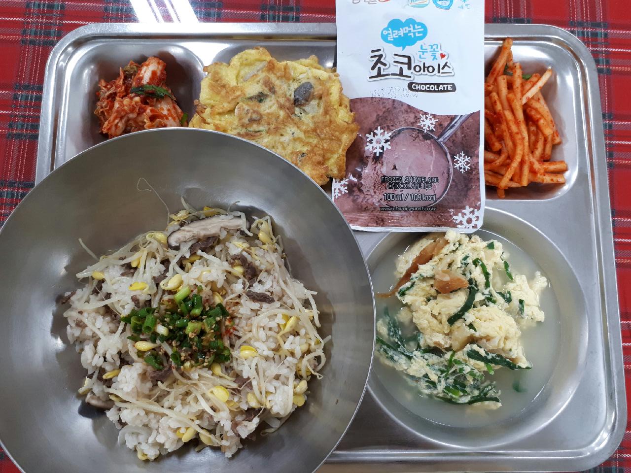 25일 중식 : 소고기콩나물밥, 북어부추계란국, 무생채, 배추겉절이, 버섯야채전, 눈꽃아이스