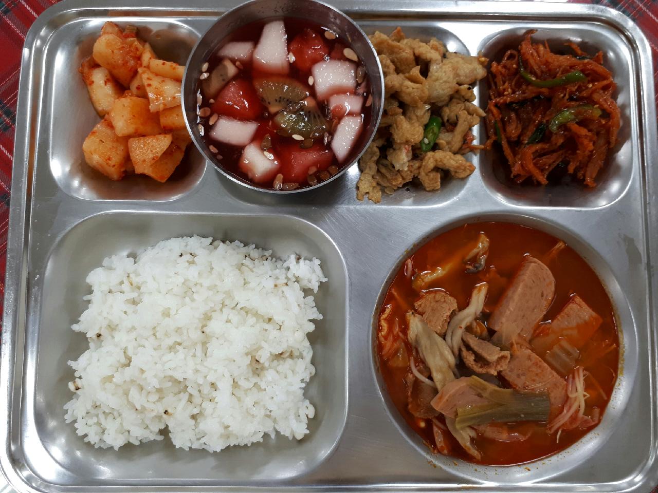 7일 중식 : 율무밥, 부대찌개, 우엉어묵고추볶음, 진미채무침, 깍두기, 오미자화채