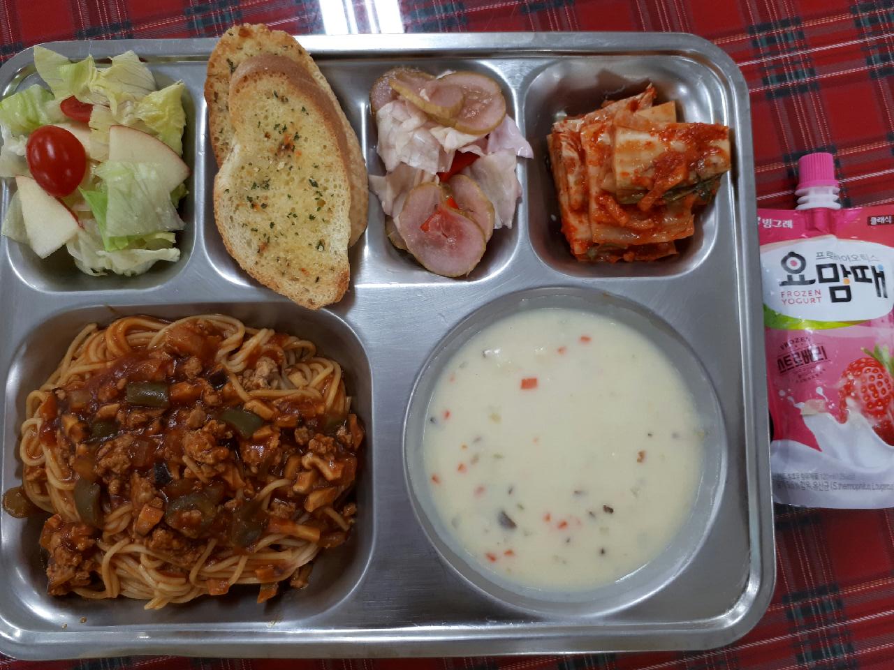 8일 중식 : 미트스파게티, 야채크림스프, 마늘빵, 양상추사과샐러드, 야채아삭피클, 배추김치, 요맘때