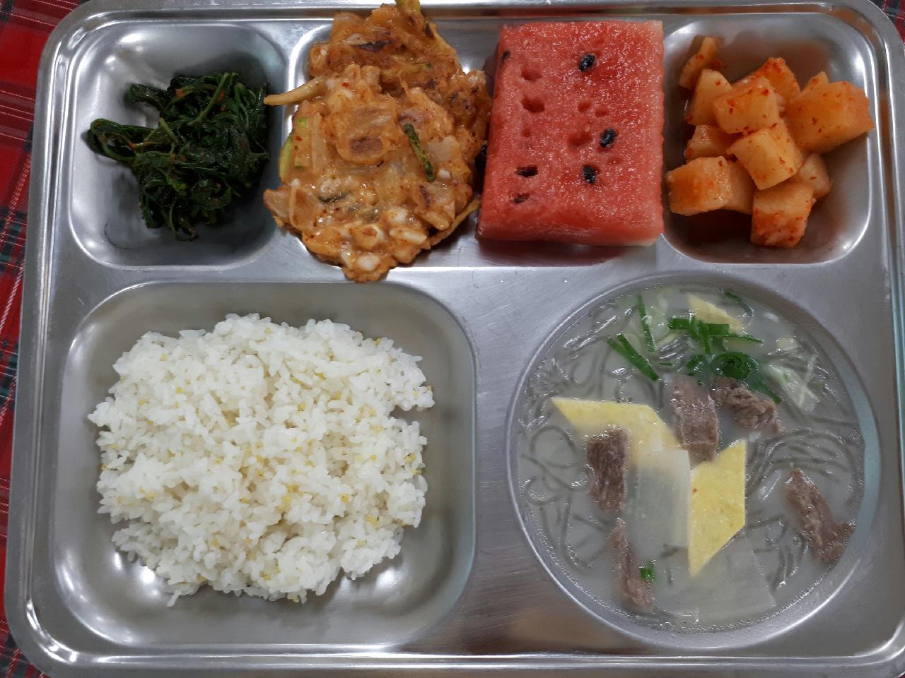 14일 중식 : 기장밥, 설렁탕/당면사리, 오징어김치전, 고춧잎나물, 깍두기, 수박