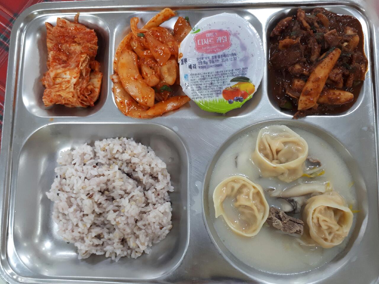 14일 중식 : 혼합10곡밥, 김치만두전골, 주꾸미철판볶음, 노각생채, 배추김치, 아이스블루베리