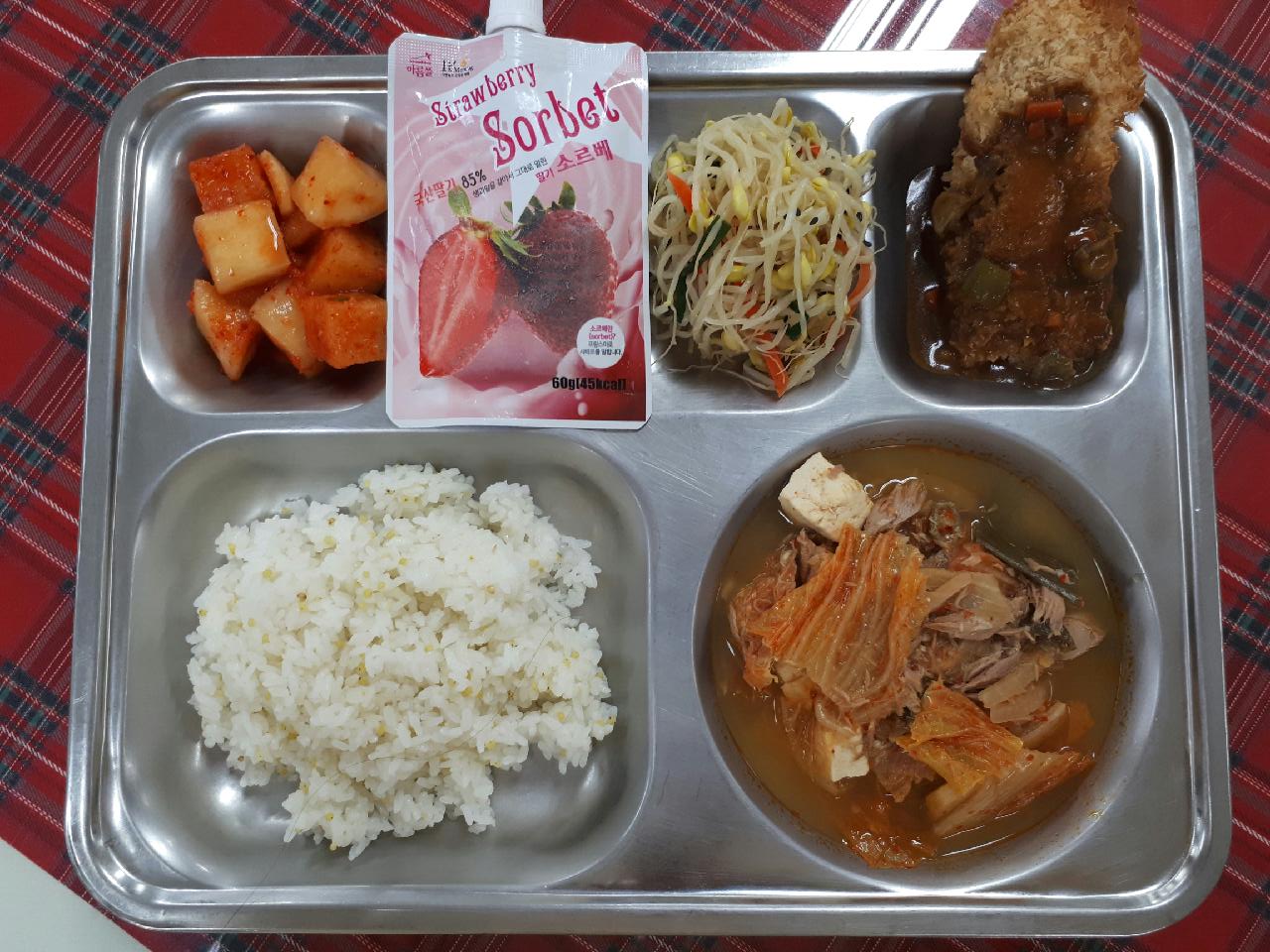 5일 중식 : 기장밥, 참치찌개, 고구마치즈롤까스/인델리커리, 콩나물무침, 깍두기, 딸기소르베