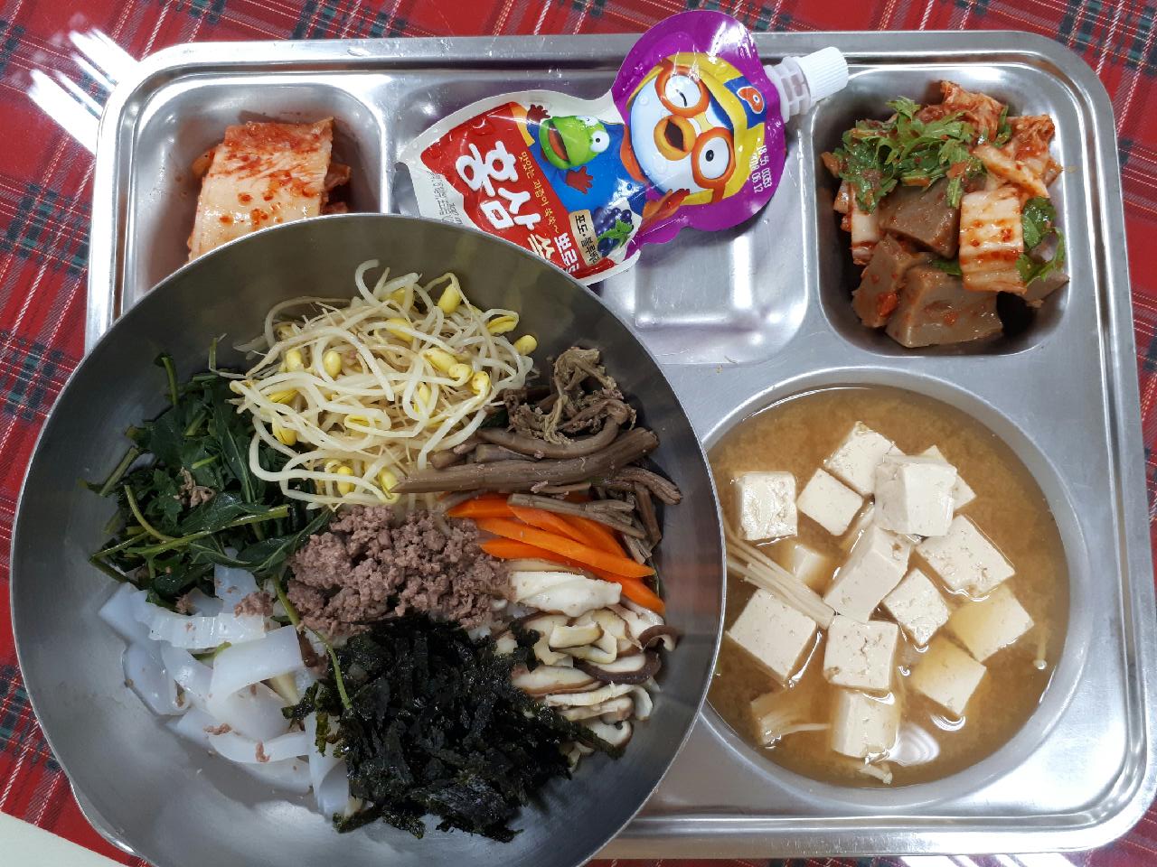 25일 중식 : 전주비빔밥, 팽이버섯미소국, 도토리묵김치무침, 배추김치, 홍삼쏙쏙