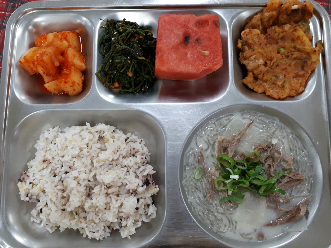 28일 중식 : 기장흑미밥, 설렁탕/당면사리, 고춧잎고추장나물, 오징어김치전, 깍두기, 수박