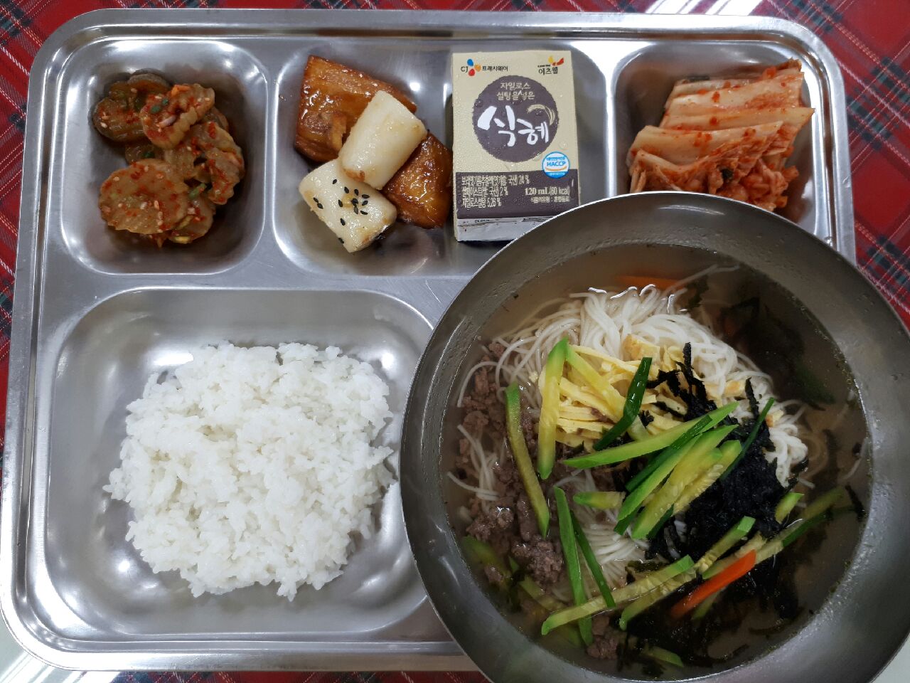 16일 중식 : 잔치국수, 오이장아찌무침, 배추김치, 고구마가래떡맛탕, 식혜