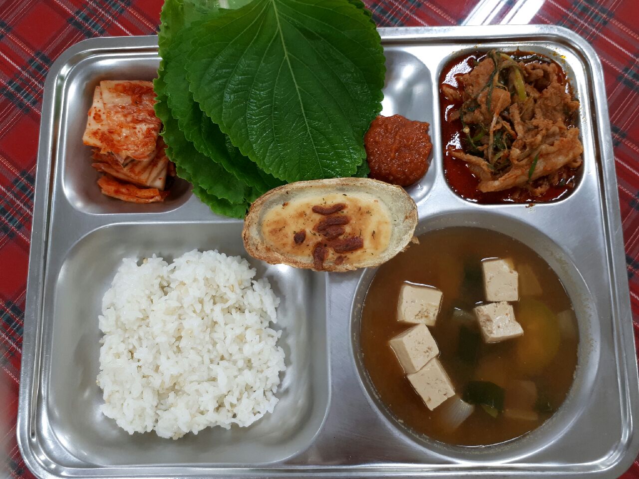 17일 중식 : 발아현미밥, 호박두부된장국, 돼지불고기, 상추,깻잎쌈/쌈장, 배추김치, 보트감자