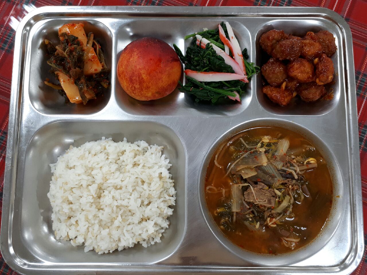 21일 중식 : 발아현미밥, 육개장, 미트볼어묵조림, 시금치맛살무침, 총각김치, 천도복숭아