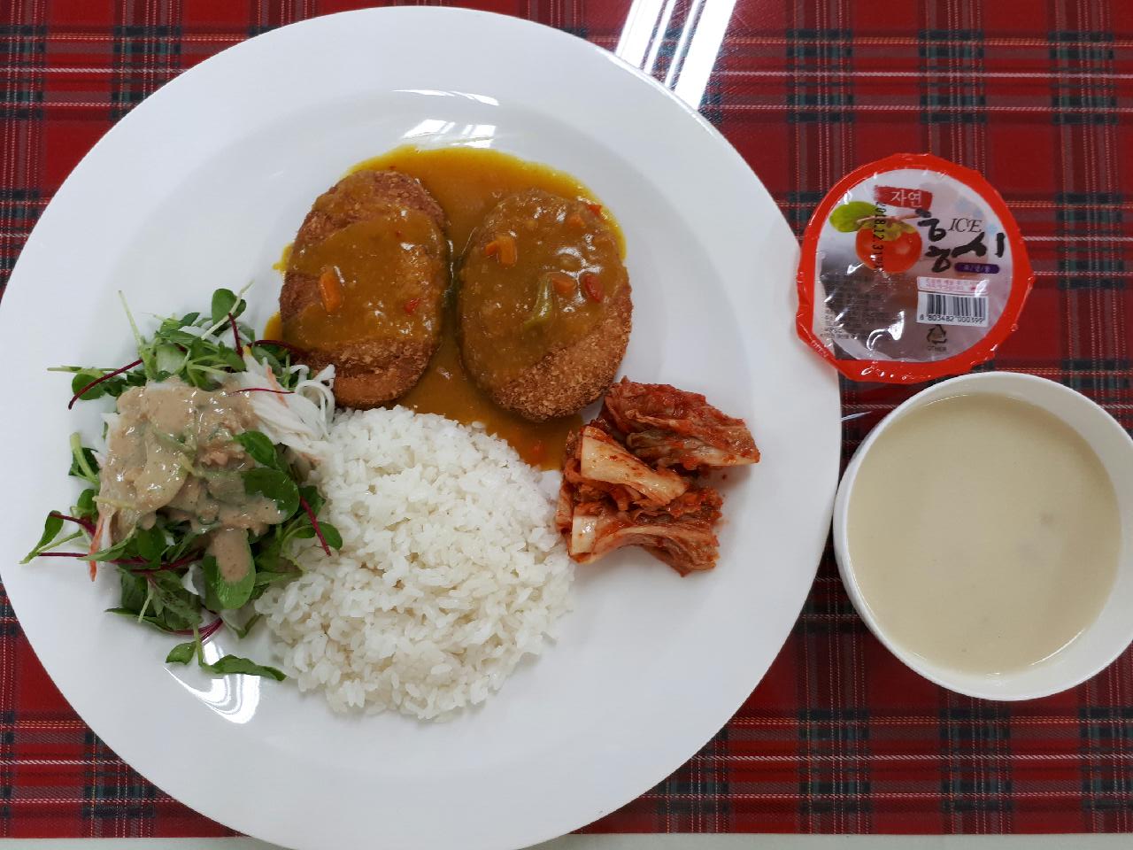 23일 중식 : 흰밥, 치킨까스/카레소스, 베이비야채크래미샐럿, 양송이스프, 배추김치, 아이스홍시
