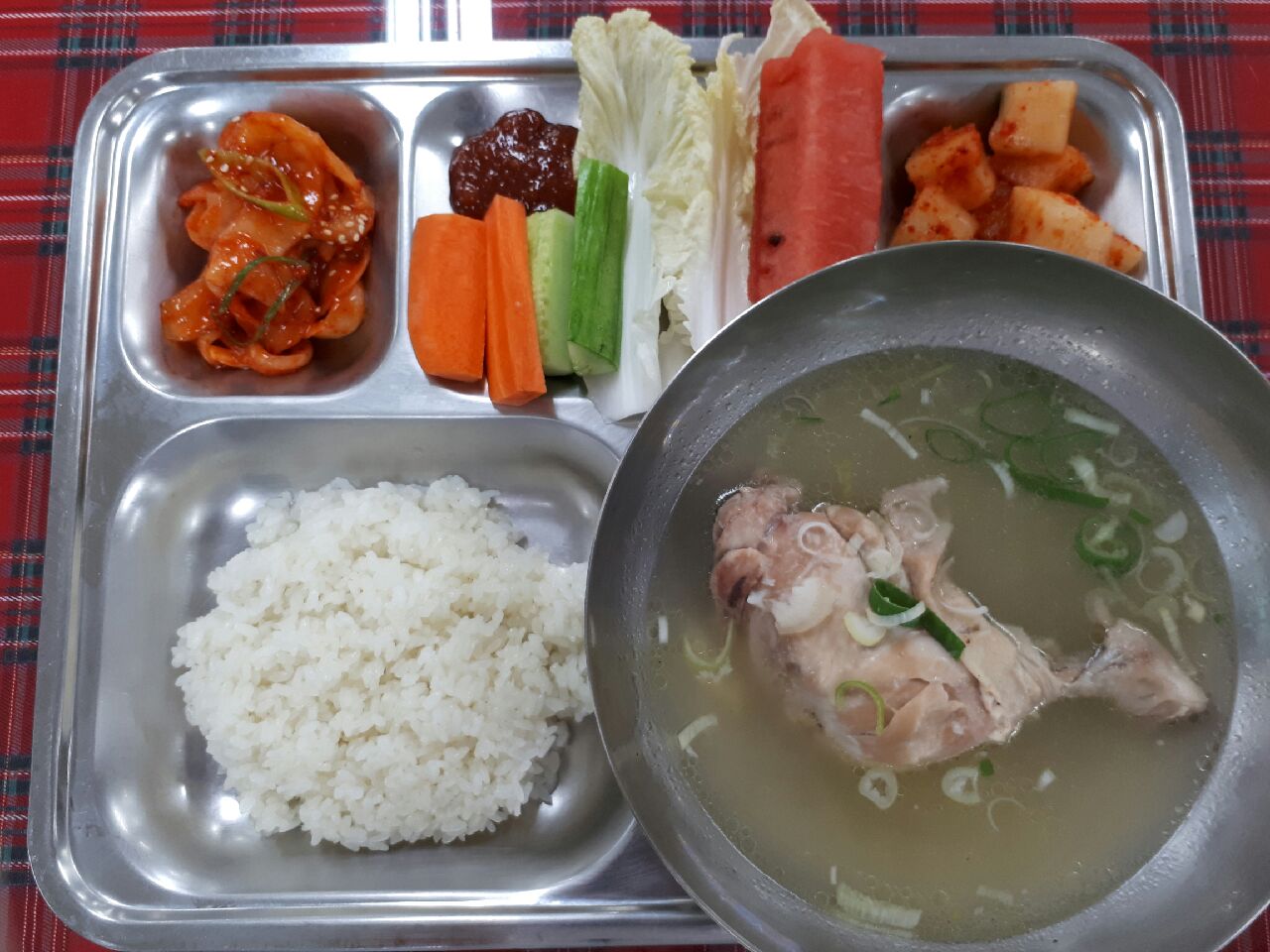 12일중식 : 찰밥, 장각삼계탕, 야채스틱/고추장, 노각생채, 깍두기, 수박