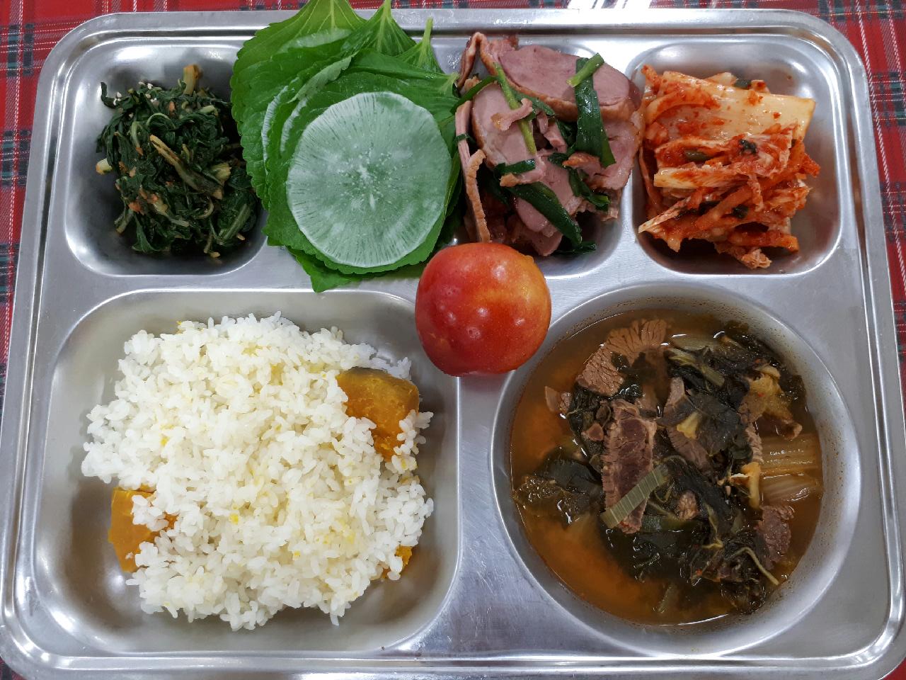13일 중식 : 단호박밥, 소고기배추국, 오리훈제, 깻잎/와사비무쌈, 근대무침, 배추김치, 자두