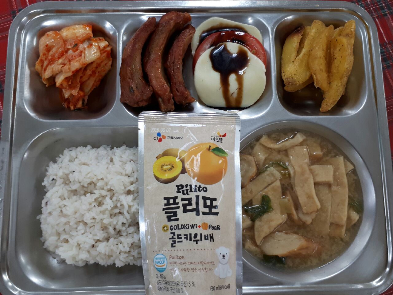 14일 중식 : 혼합잡곡밥, 어묵미소국, 바베큐폭립, 갈릭웨지감자, 카브레제샐러드, 배추김치, 골드키위배쥬스