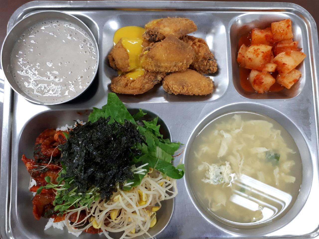 19일 중식 : 낙지야채비빔밥, 탕파국, 닭날개튀김/머스터드, 깍두기, 유자바나나스무디
