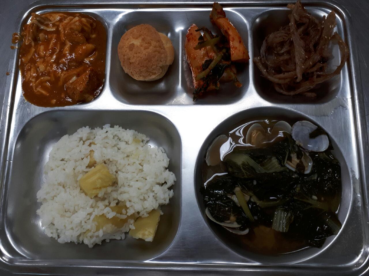 20일 중식 : 고구마밥, 바지락배추된장국, 치즈불닭, 진미채간장조림, 배추김치, 생크림비스킷아이스슈