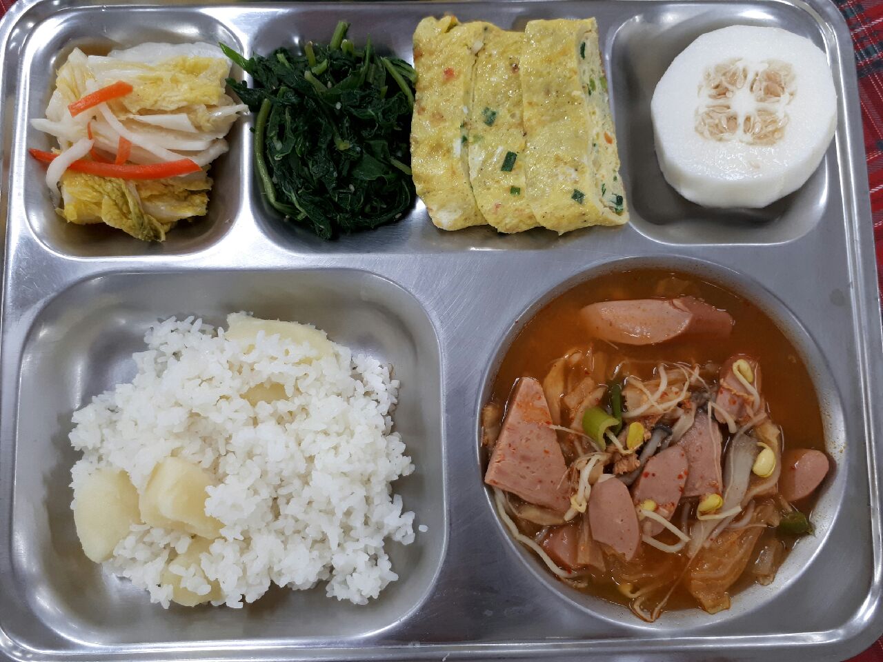 6일 중식 : 감자밥, 부대찌개, 야채계란말이, 깻잎순볶음, 백김치, 참외
