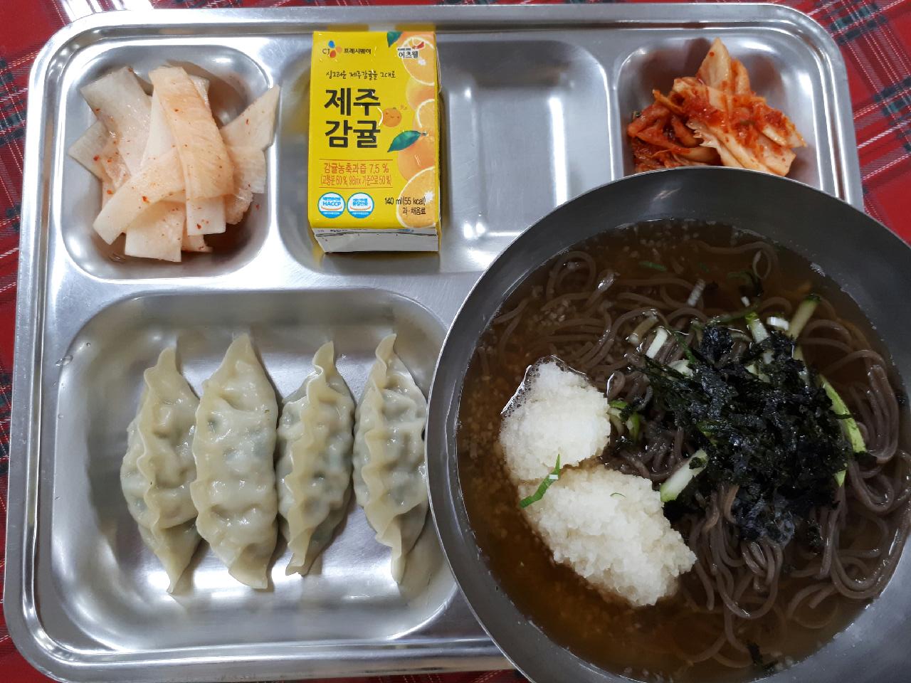 7일 중식 : 메밀소바, 왕교자만두, 냉면무김치, 배추김치, 제주감귤쥬스
