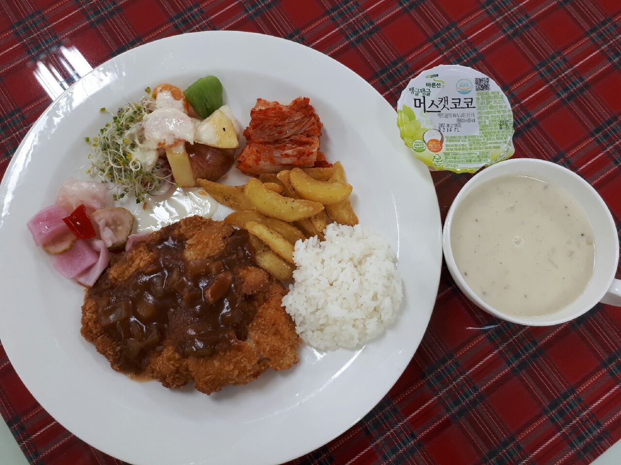 30일 중식 : 흰밥, 수제돈까스/파마산소스, 옥수수크림스프, 과일샐럿/파인소스, 갈릭웨지감자, 야채피클, 배추김치, 머스캣코코